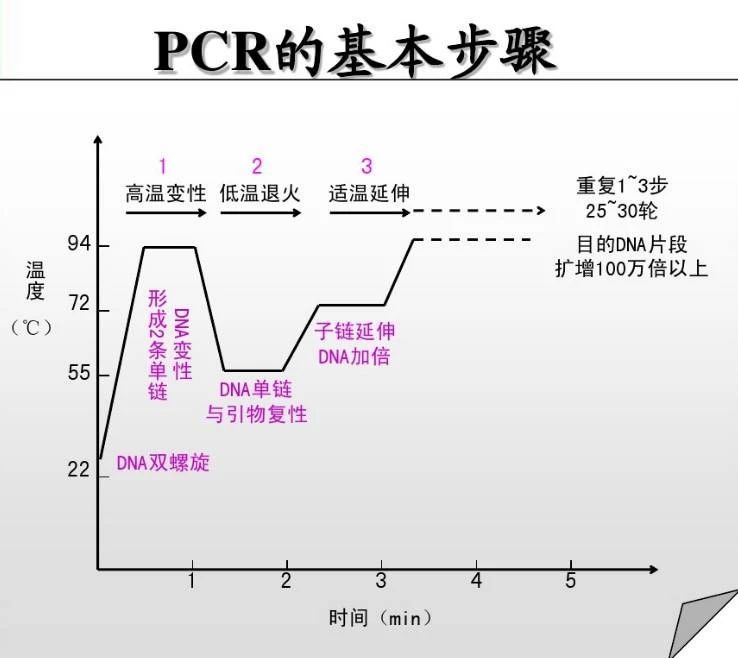 PCR又稱聚合酶鏈反應,是體外擴增目的DNA片段的方法,在多方面廣泛應用,主要分為三大步驟:高溫變性、低溫退火、適溫延伸。分別添加引物、模板、Taq酶、dNTP和緩沖液等反應物混合,在約為95℃環境下,雙鏈DNA氫鍵斷裂解旋為單鏈;單鏈與人工設計的引物在約為60℃溫度下,按照堿基互補配對的原則相結合;并升溫到72℃左右,利用Taq酶延伸合成一條新的與模板DNA鏈互補的半保留復制鏈