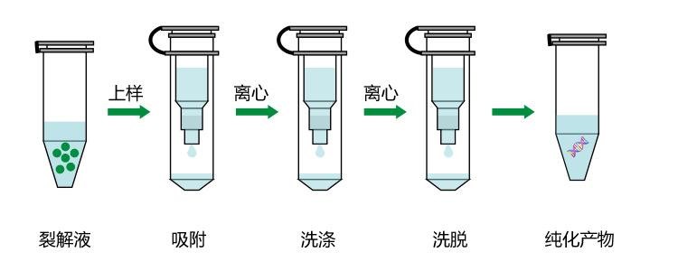 原理是柱由特殊硅基質吸附材料構成,可特異性結合DNA,其余蛋白質等雜質因不被吸附而去除了,過程中需與離心機配合使用,提取得到的核酸純度有一定保障,但耗樣量較大,反復工作對大通量檢測不友好。