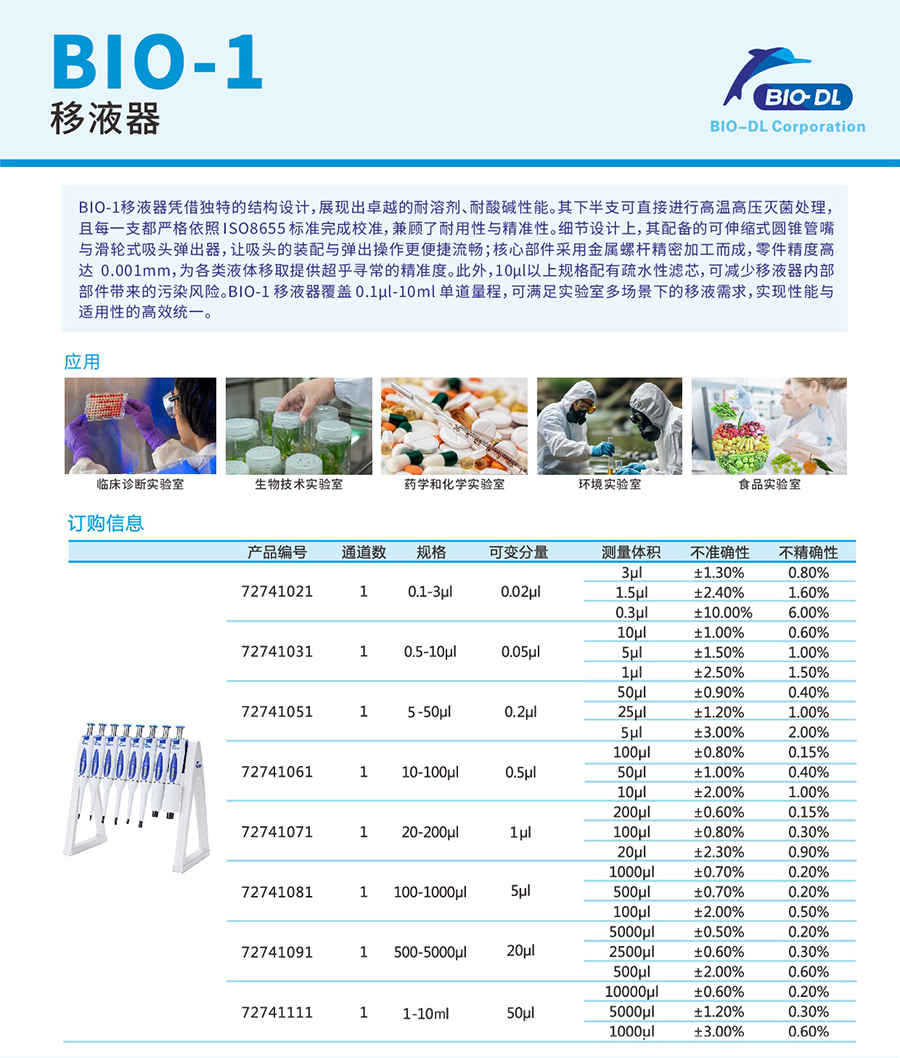 移液器Bio-1特選精良的材質,具有出色的耐化學腐蝕性和抗紫外線性能,可伸縮式圓錐管嘴和滑輪式吸頭彈出器使吸頭更容易裝配和彈出,四位數字顯示窗,為移取各種類型液體提供更精確的結果。涵蓋0.1μ1-10ml單道量程及0.5u1-300ul多道量程。