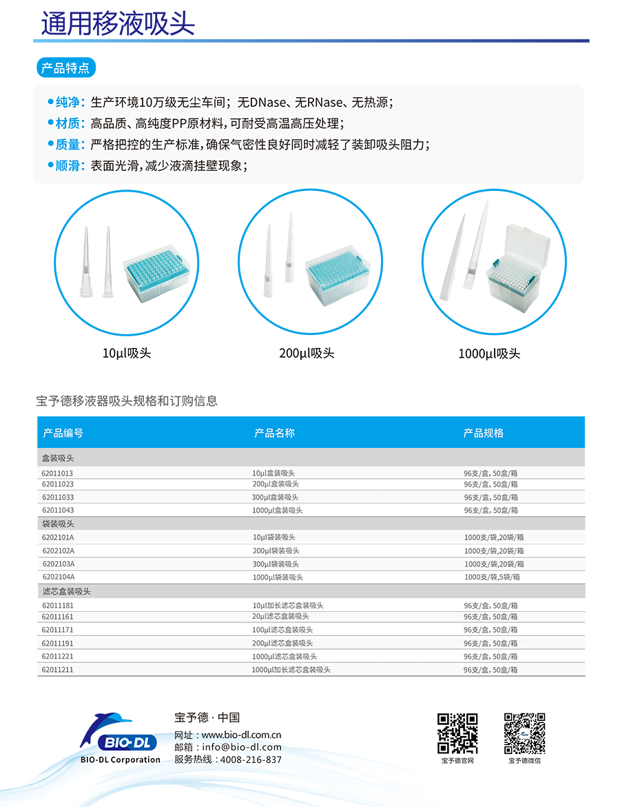 BIO-DL為您提供精確的移液器吸頭,與大多數(shù)其他品牌移液器一起使用,都具有更好的可重復(fù)性和準(zhǔn)確度。
